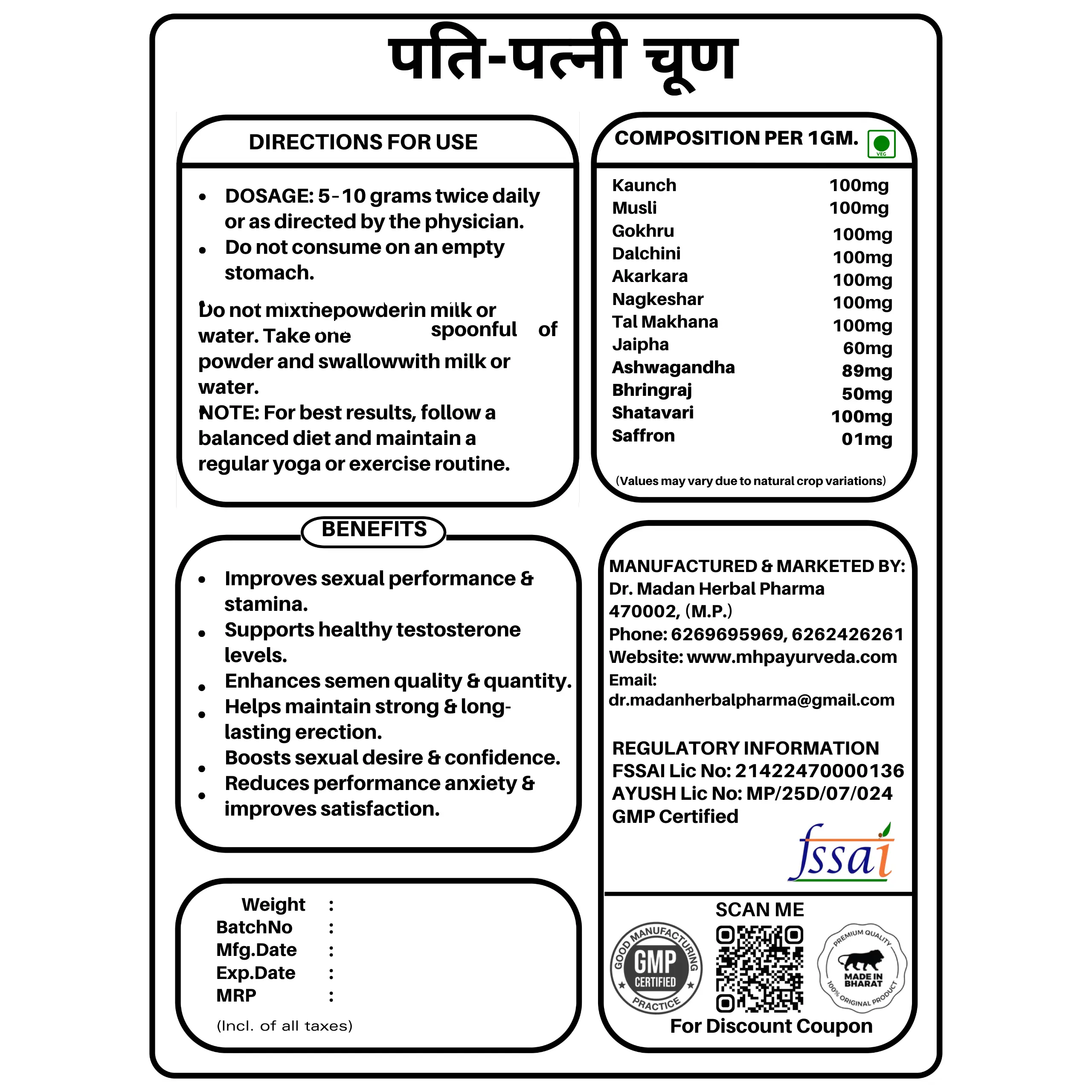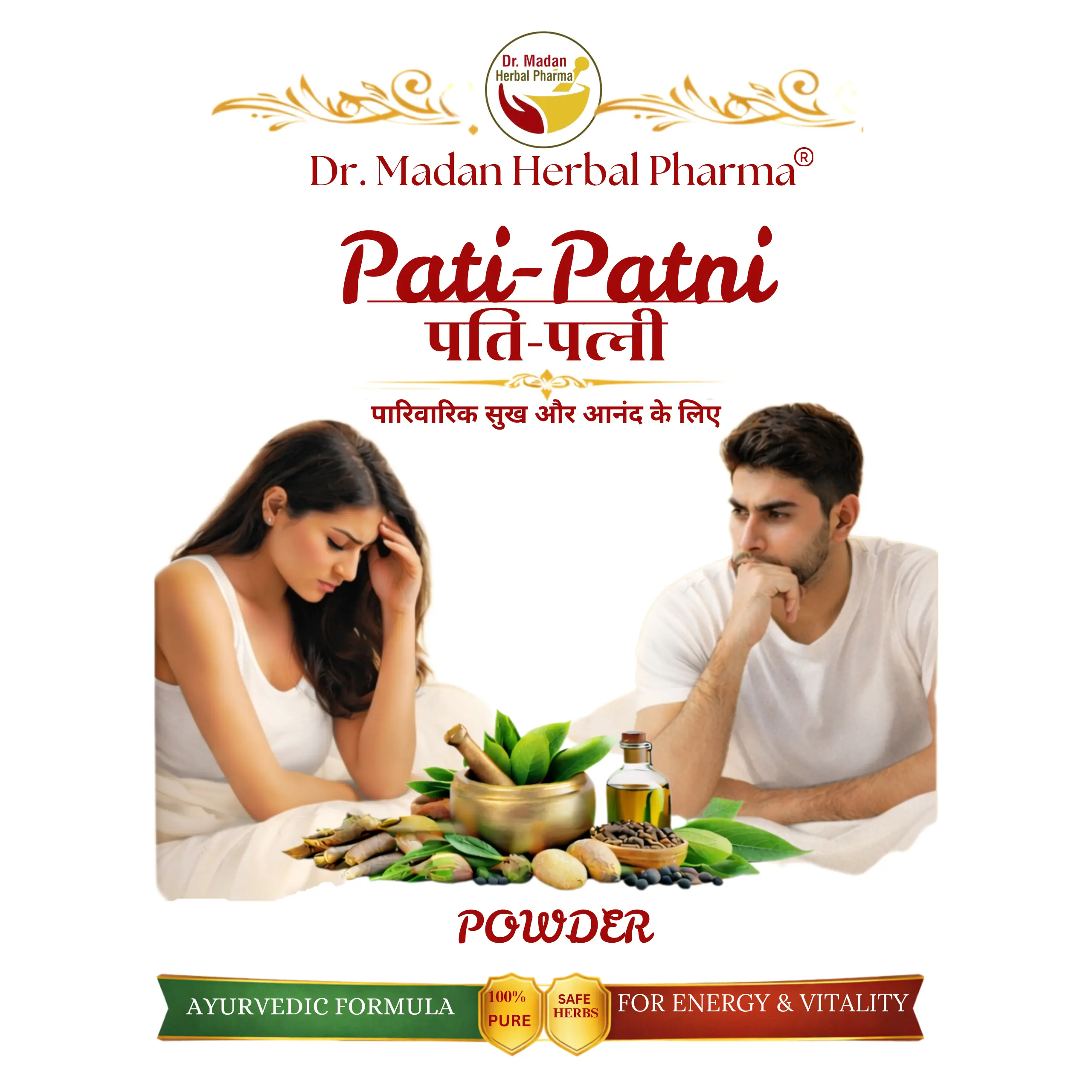 Pati-Patni Churn by Dr. Madan Herbal Pharma is a natural Ayurvedic herbal powder formulated to support energy, stamina, and overall vitality while promoting confidence and relationship wellness by enhancing strength, improving performance, boosting endurance, and supporting long-lasting daily wellness naturally.